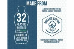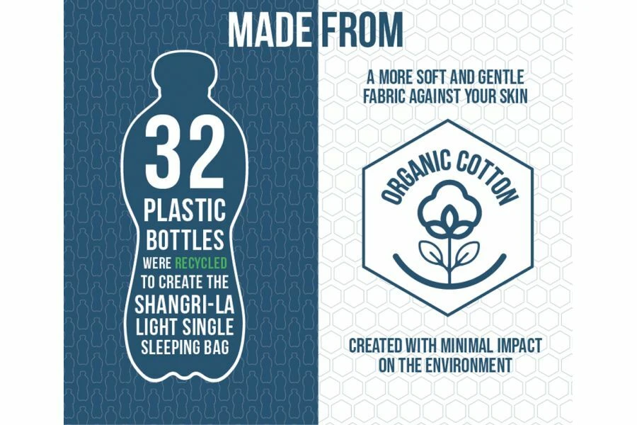 A luxury sleeping bag to match the range of self-inflating mattresses, the Vang Shangri-La Light sleeping bag is a single sleeping bag with organic cotton, a soft feel, and a comfortable feel, to create a great night’s sleep. Designed with sustainability in mind, the Shangri-La Light uses 32 single-use plastic bottles to create a 100% recycled polyester, with organic cotton for a soft feel on your skin, which is hypo-allergenic.