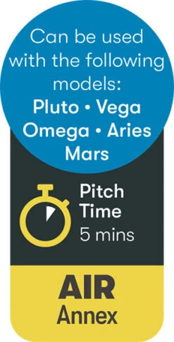 | Features | AES – Air system – 4 layers for added durability and a simplified method of use Anti weather system – includes extra rain protectors on zips, waterproof toggle points and additional weather protection double coated panels Inner Tent ready Pano View – large windows providing you with all round views Hydrodore Fabric – Very Light weight, single person pitch annex with quick dry fabric UV 50+ rating providing you with the highest UV protection |